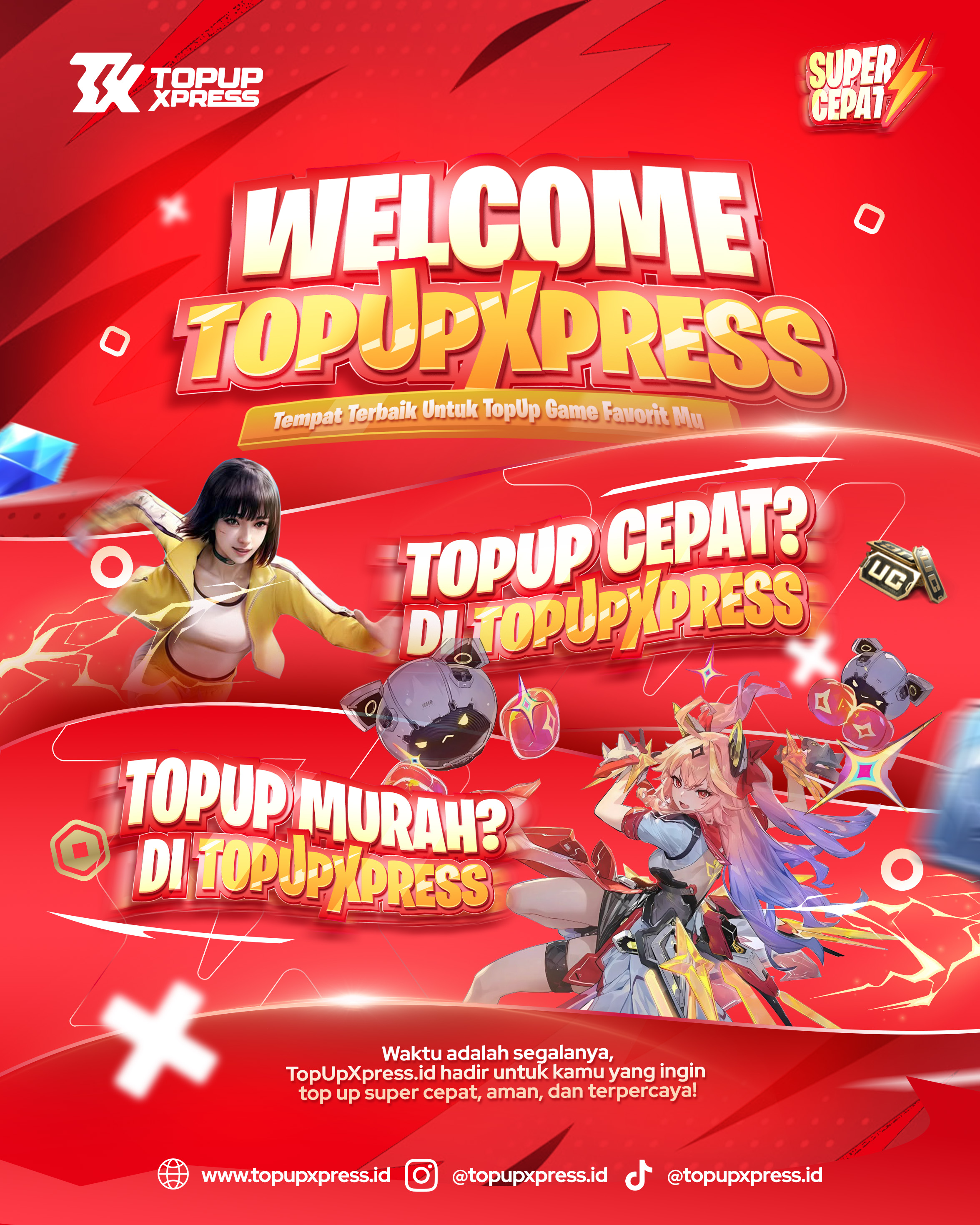 Dengan sistem yang praktis dan pelayanan yang profesional, Topupxpress memastikan setiap transaksi berlangsung lancar. Tidak perlu menunggu lama, tidak perlu khawatir soal keamanan, cukup pilih produk, lakukan pembayaran, dan nikmati hasilnya langsung di akun game kamu.